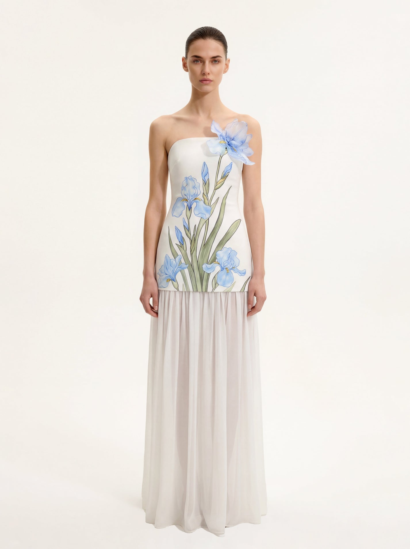 Abito lungo senza spalline con stampa floreale effetto acquerello - Giallo