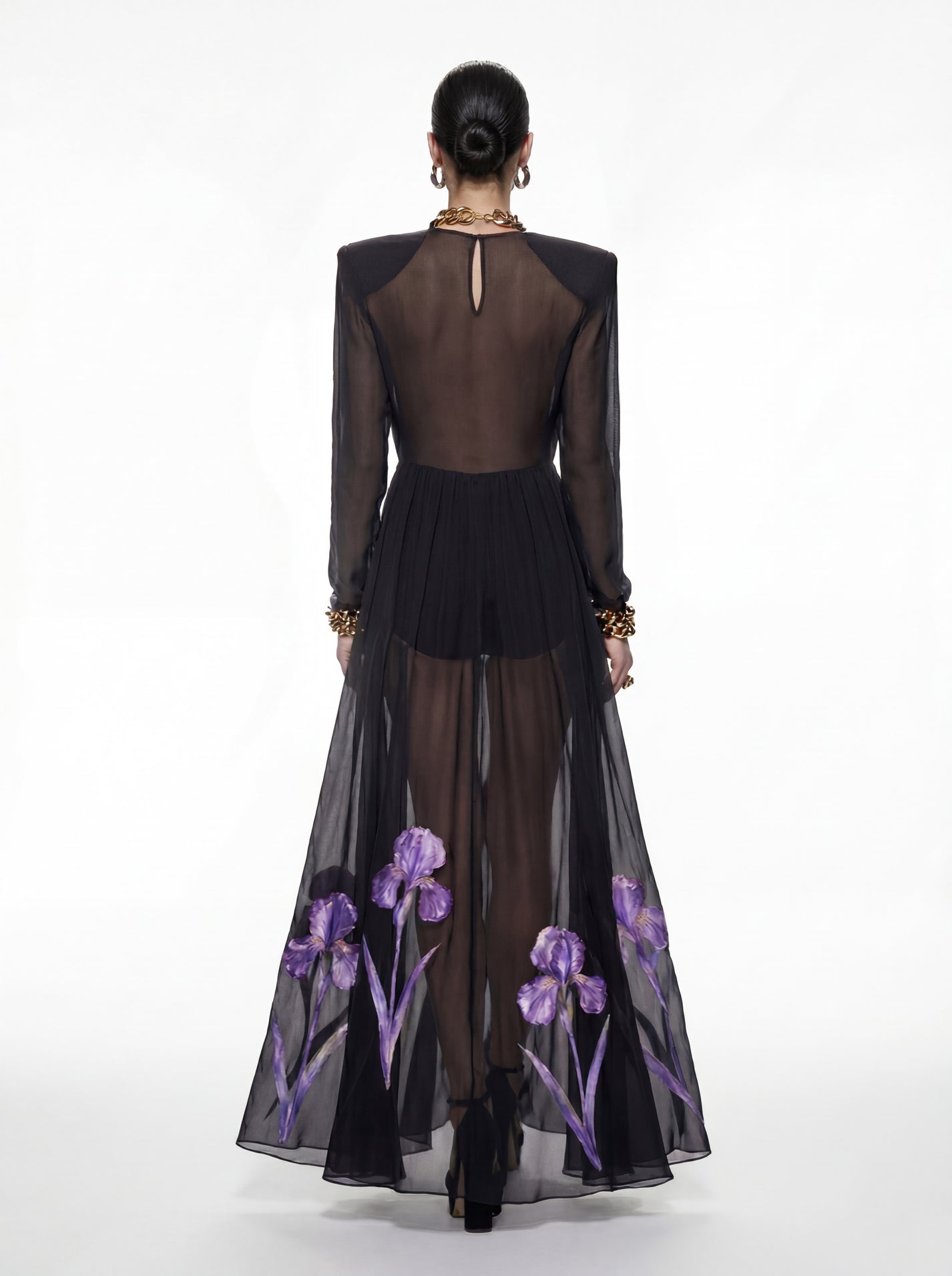 Abito lungo trasparente a maniche lunghe con stampa floreale Iris - Nero/Viola