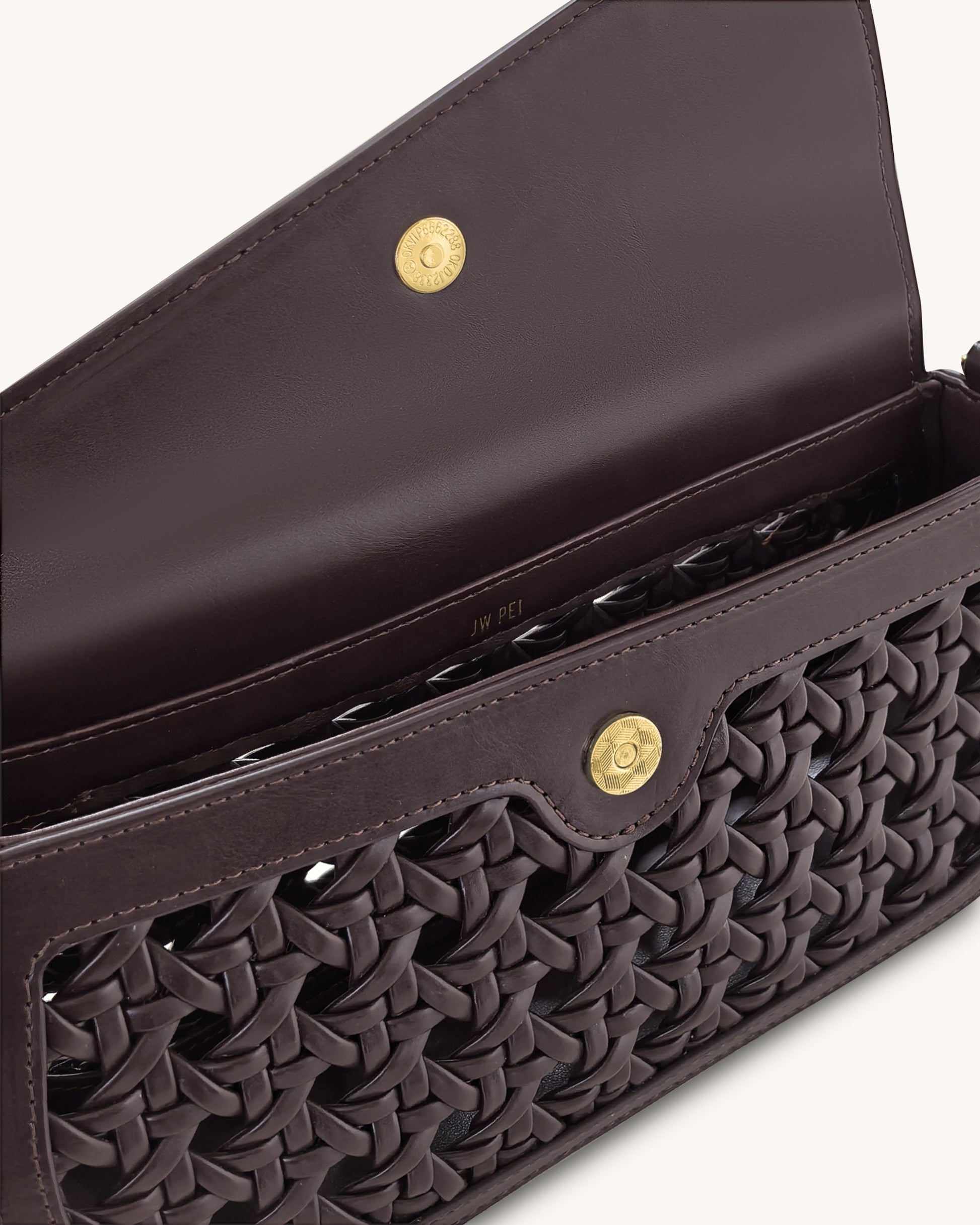 Elegante e strutturata con pannello goffrato contemporaneo. Pelle vegana marrone intenso con ferramenta dorata per un aspetto sofisticato. Tracolla regolabile per un comodo trasporto a spalla.