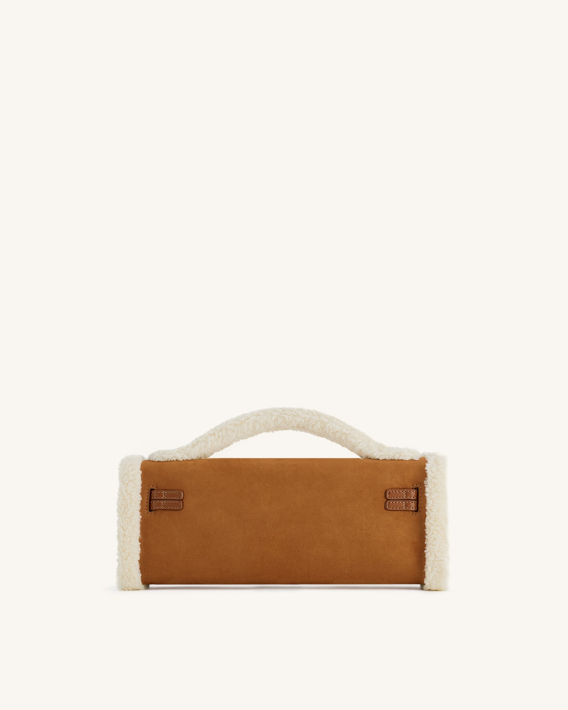 Borsa strutturata rettangolare con manico superiore, realizzata in finta pelle scamosciata marrone e rifinita con bordo in shearling. Completata da dettagli in metallo dorato e una chiusura a girello sicura. Compatta, calda ed elegante.