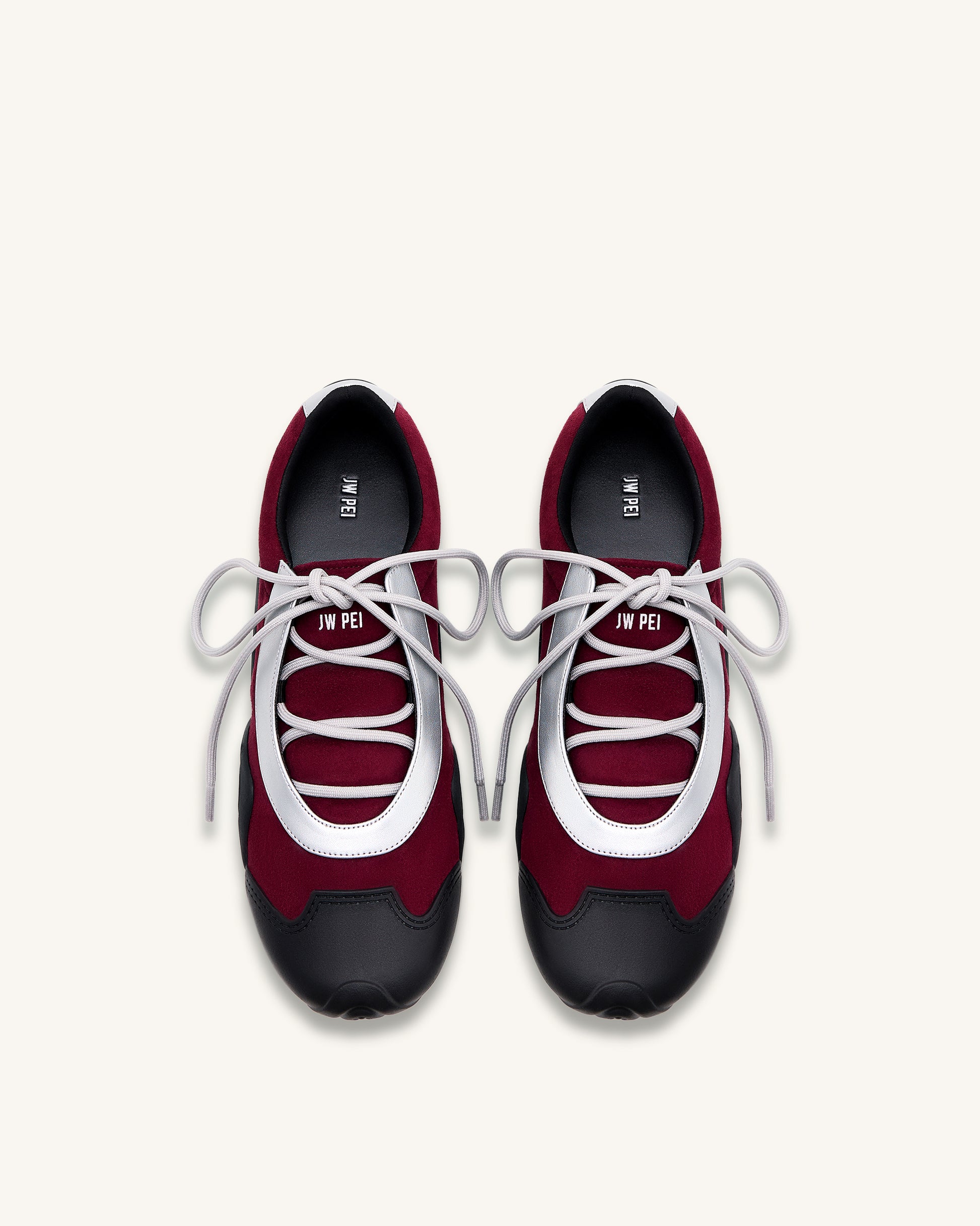 Queste sneakers sportive con allacciatura presentano una tomaia bordeaux con inserti grigi a contrasto e suole nere testurizzate. Leggere e flessibili, offrono una calzata comoda per l’uso quotidiano aggiungendo un tocco atletico moderno al tuo look.