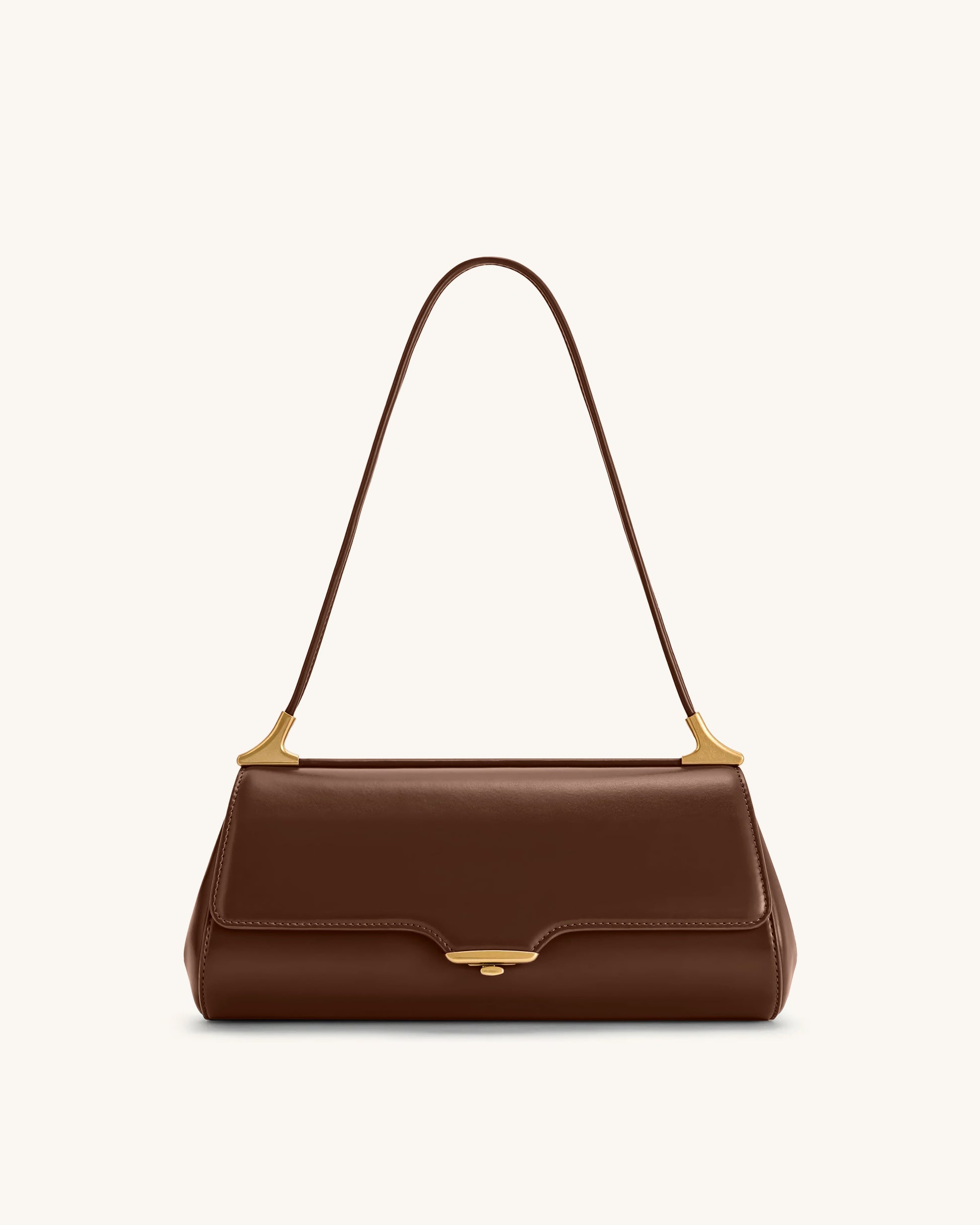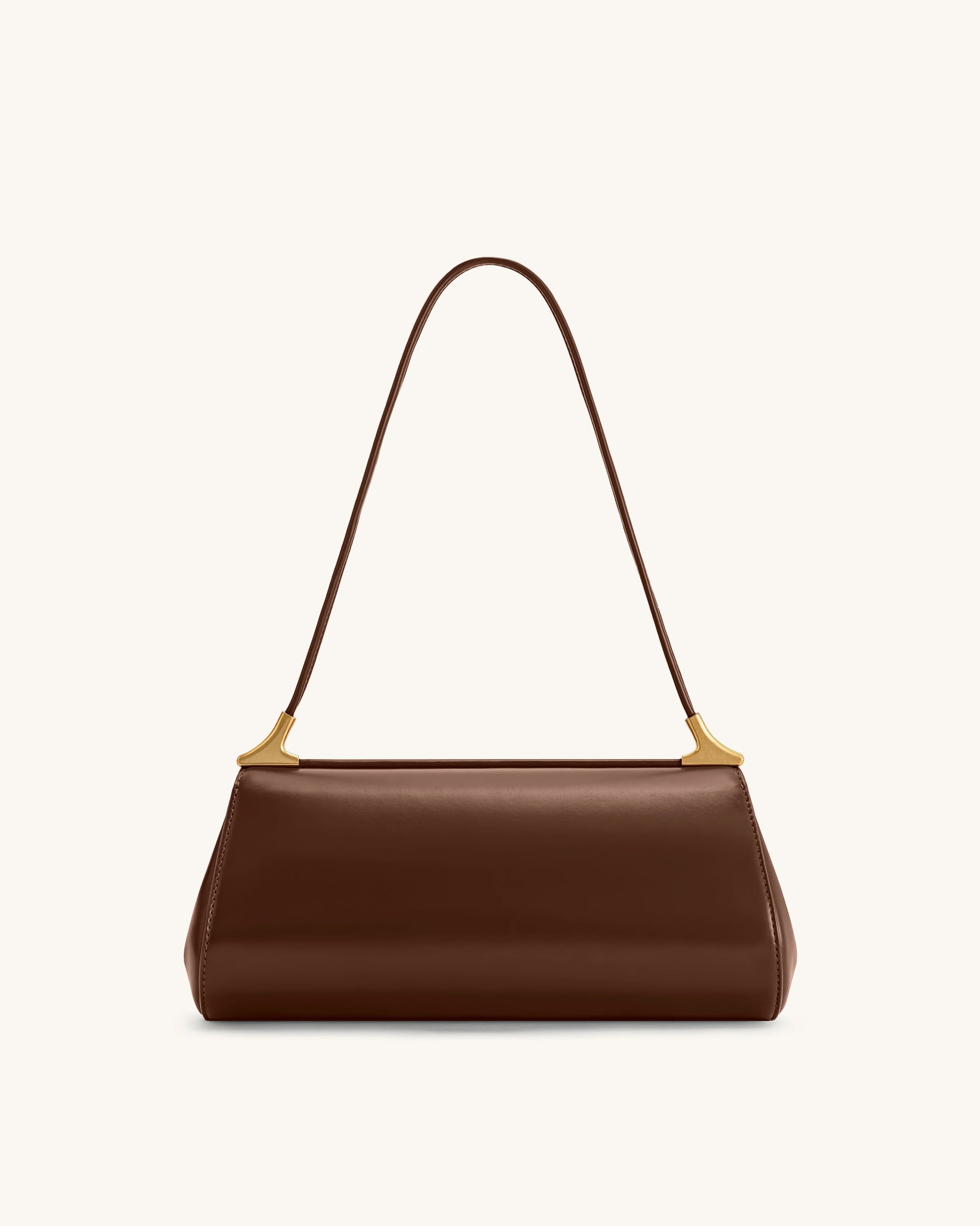 Elegante borsa a spalla marrone con struttura slanciata. I dettagli in ferramenta dorata aggiungono un tocco di raffinatezza. Perfetta per gli elementi essenziali e l’uso quotidiano.