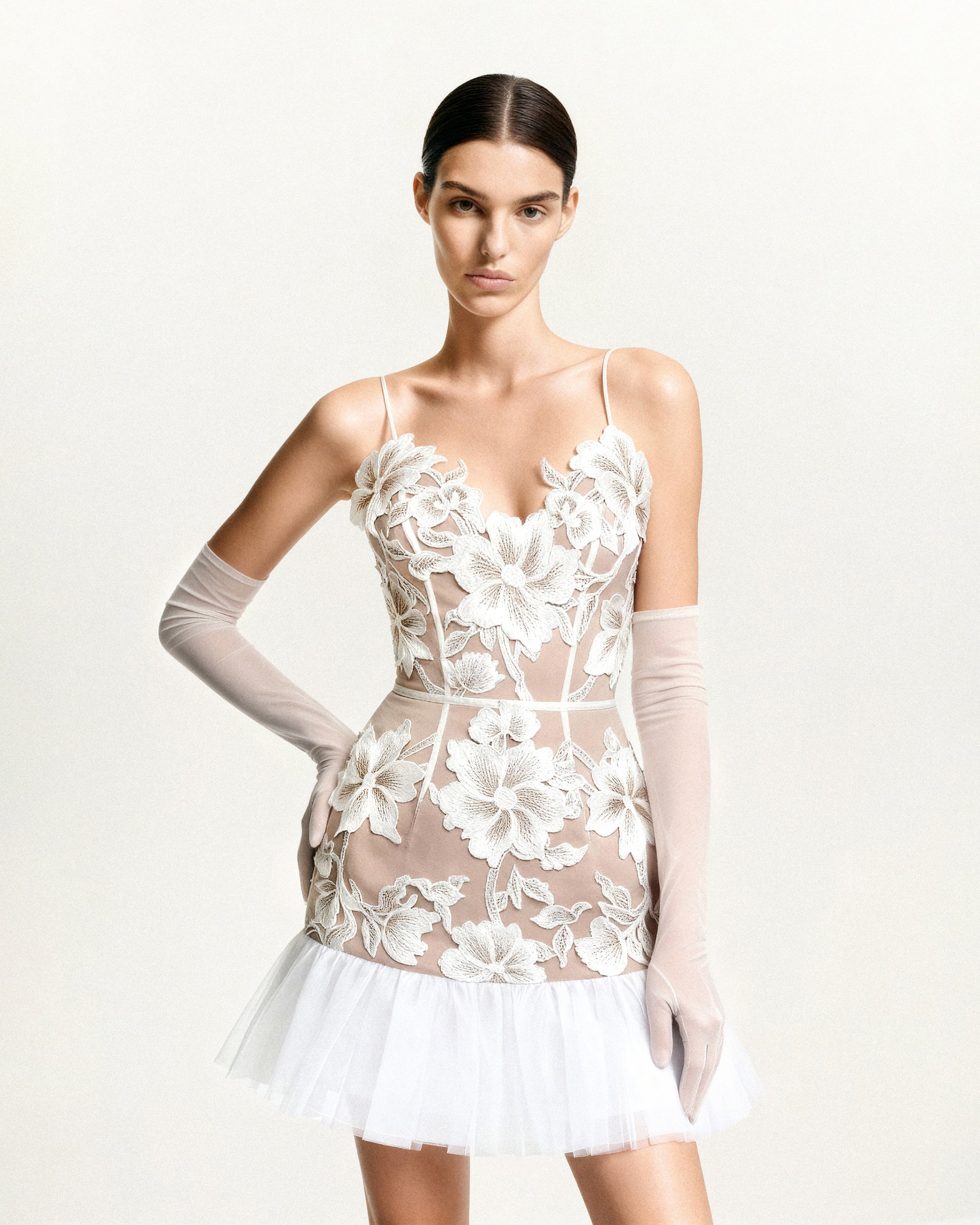 Eleganza e romanticismo si incontrano in questo mini abito in mesh trasparente decorato con ricami floreali 3D intricati. Con una base color nude e delicati fiori bianchi su tutta la superficie, il corpetto aderente e l’orlo svolazzante creano una silhouette valorizzante. Perfetto per serate romantiche, eventi nuziali o ogni occasione in cui vuoi sentirti davvero speciale.