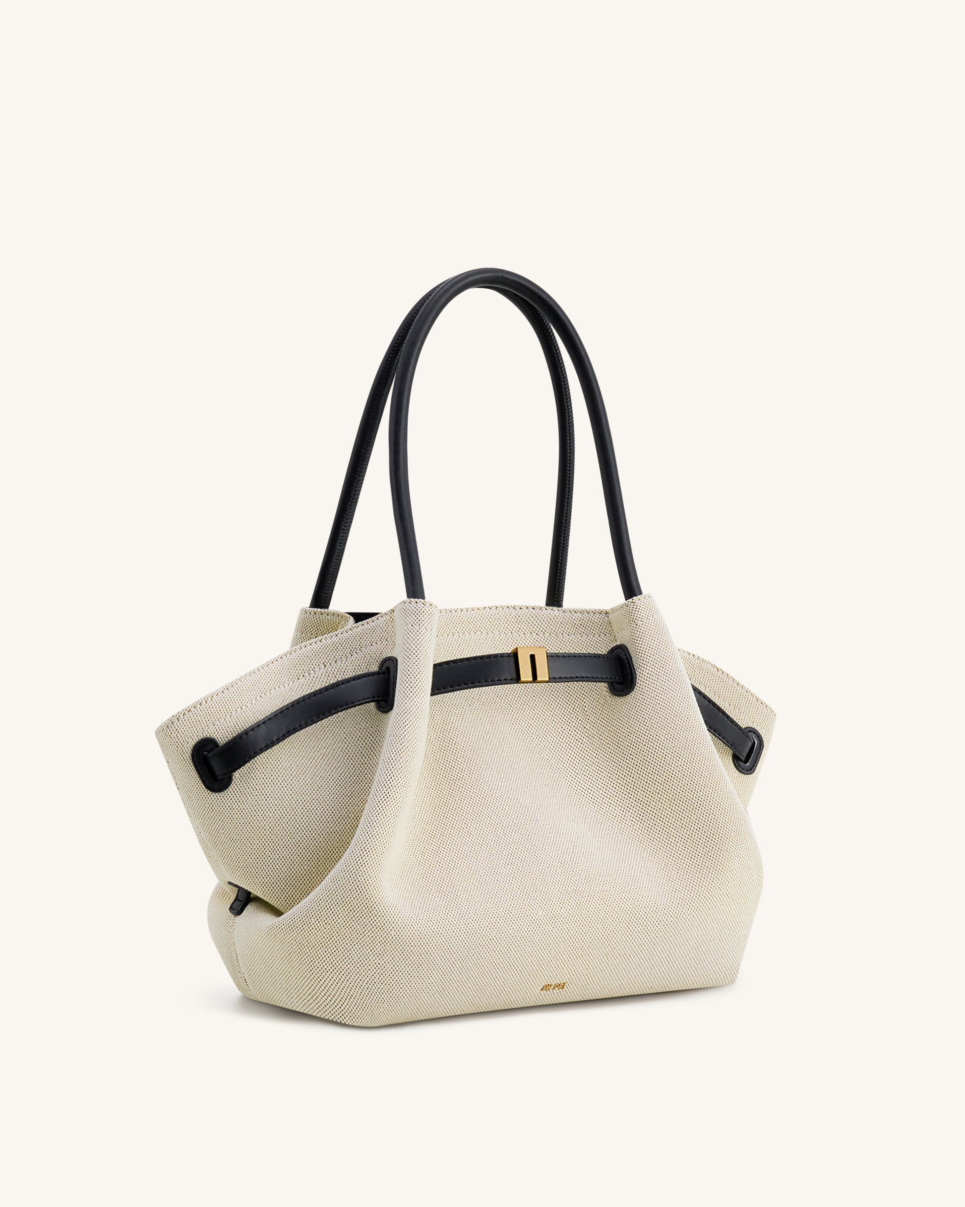 Questa borsa tote a trapezio presenta un corpo in tela crema testurizzata abbinato a manici e dettagli di rifinitura neri eleganti. Progettata con una silhouette a apertura superiore e dettagli in tonalità oro, offre un look minimalista ma sofisticato—perfetta per il lavoro, il brunch o le commissioni quotidiane.