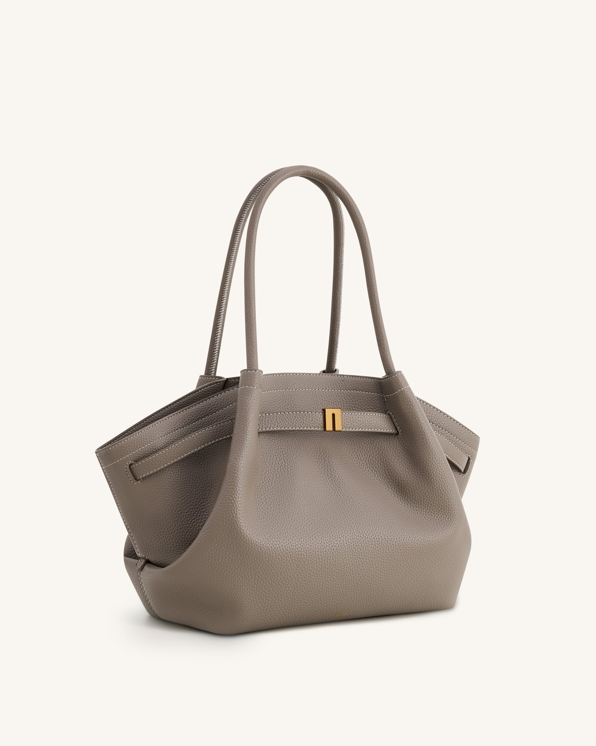 Questa borsa tote a trapezio in grigio tortora presenta una silhouette strutturata ma morbida, con una texture a grana e cuciture a contrasto. Progettata con manici allungati e dettagli in tonalità oro, offre un’eleganza senza tempo e una funzionalità spaziosa—ideale per l’uso quotidiano o il tragitto casa-lavoro.