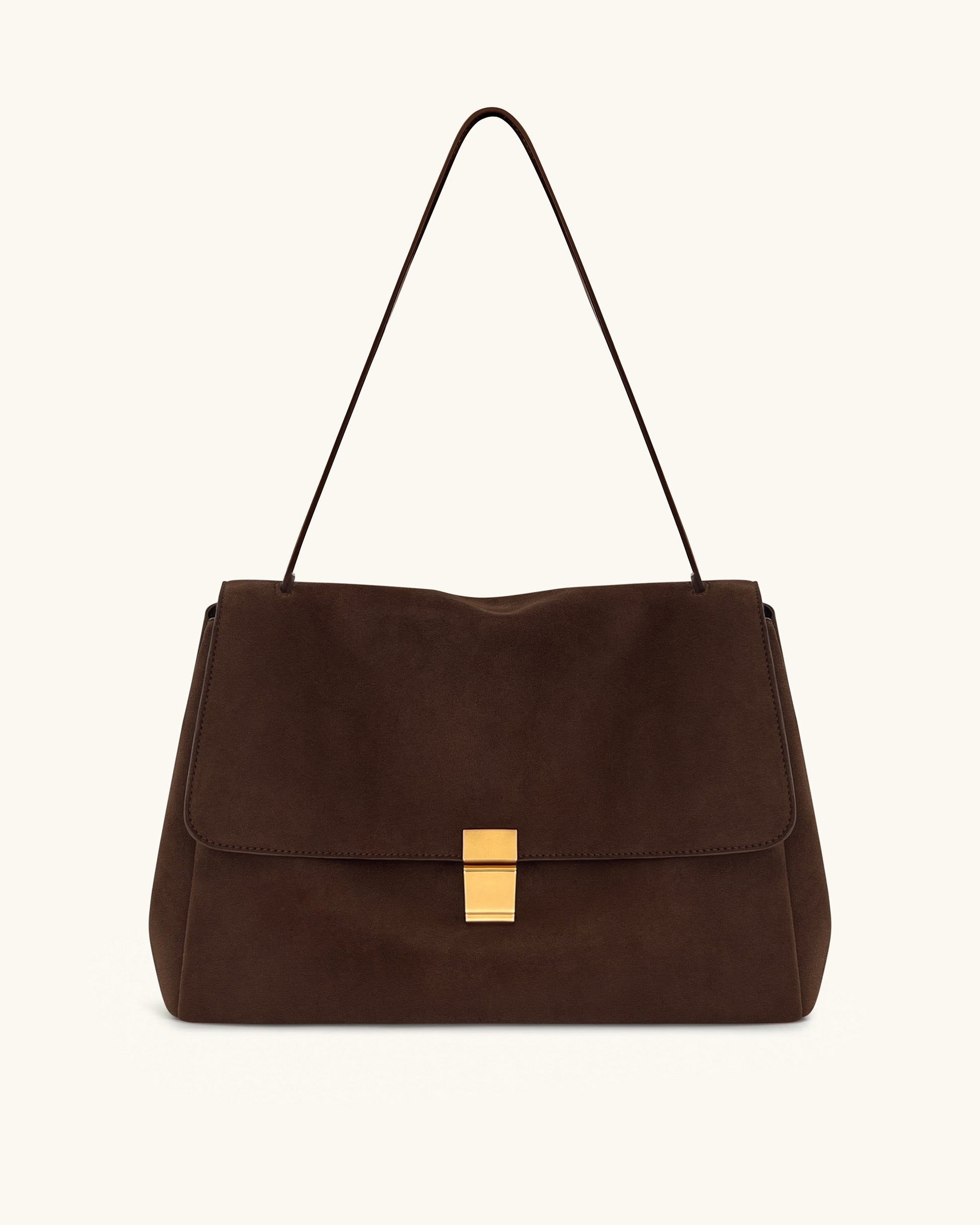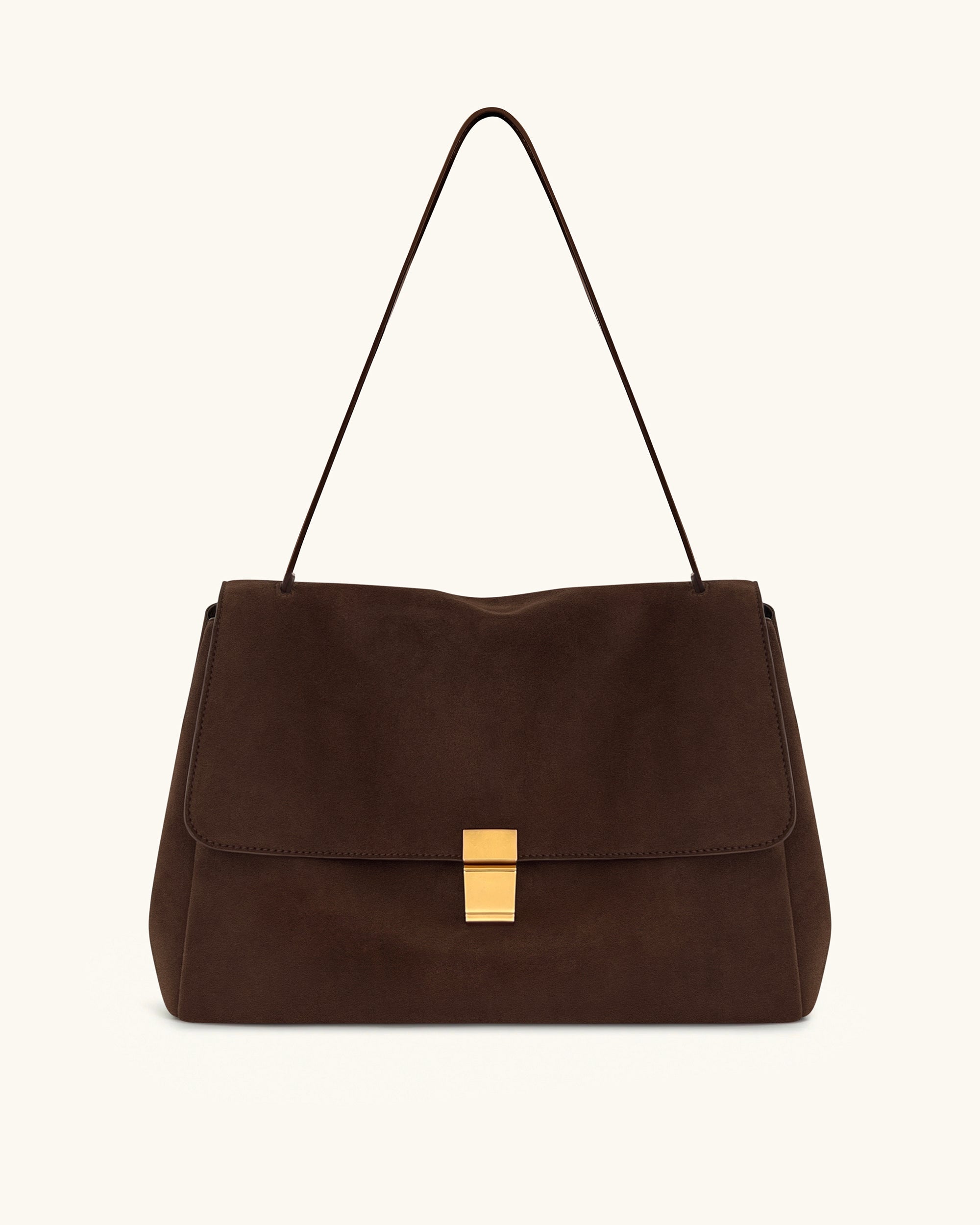 Questa elegante borsa a spalla presenta una finitura lussuosa in finta pelle scamosciata di un ricco tono marrone scuro. Progettata con una silhouette strutturata, una chiusura color oro e una tracolla sottile, dona un’eleganza discreta al tuo stile quotidiano.