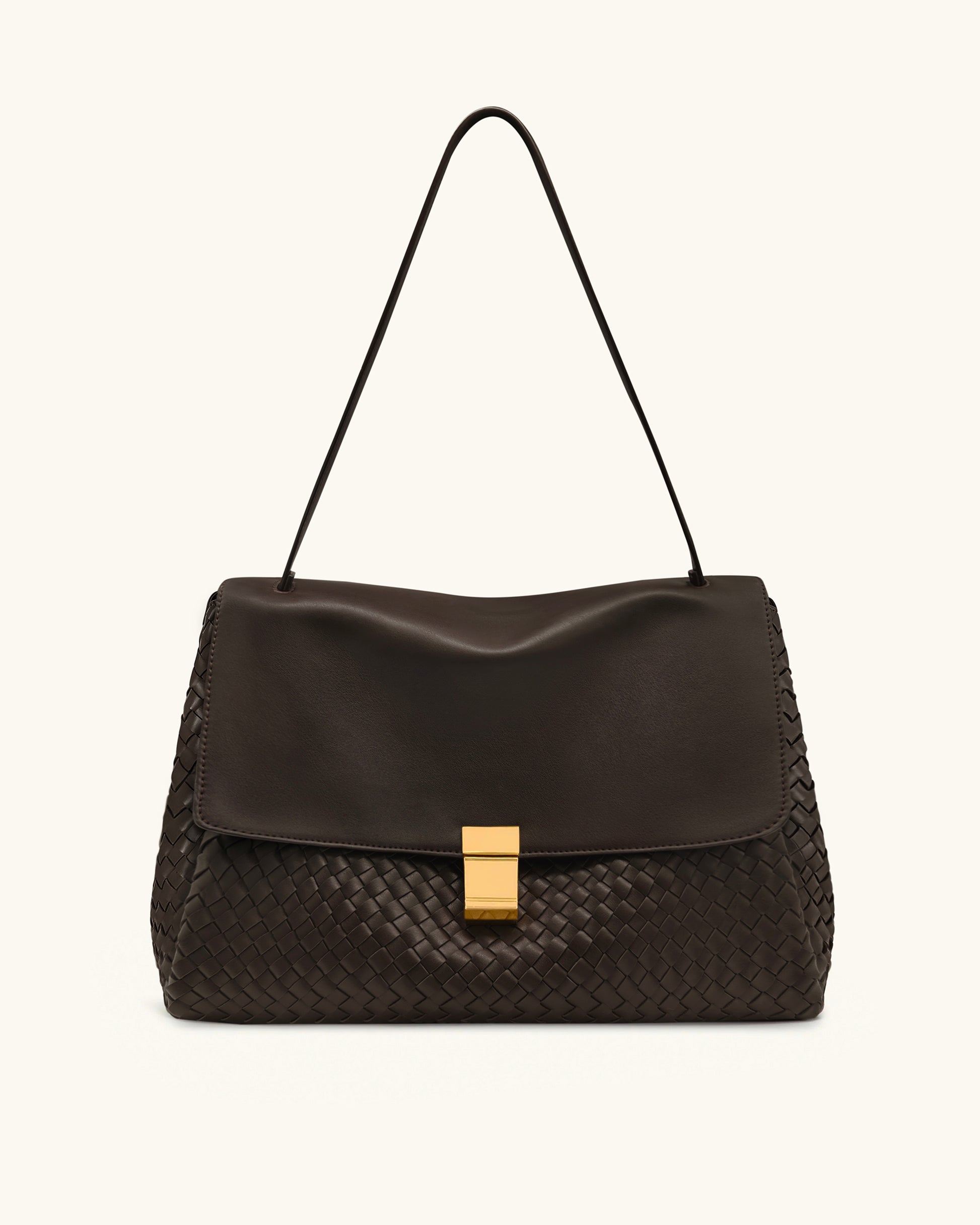 Questa sofisticata borsa a spalla è realizzata con una patta liscia in pelle sintetica e una base intrecciata in un profondo tono espresso. Arricchita da una chiusura color oro e una tracolla minimalista, offre un’eleganza senza tempo e funzionalità quotidiana.