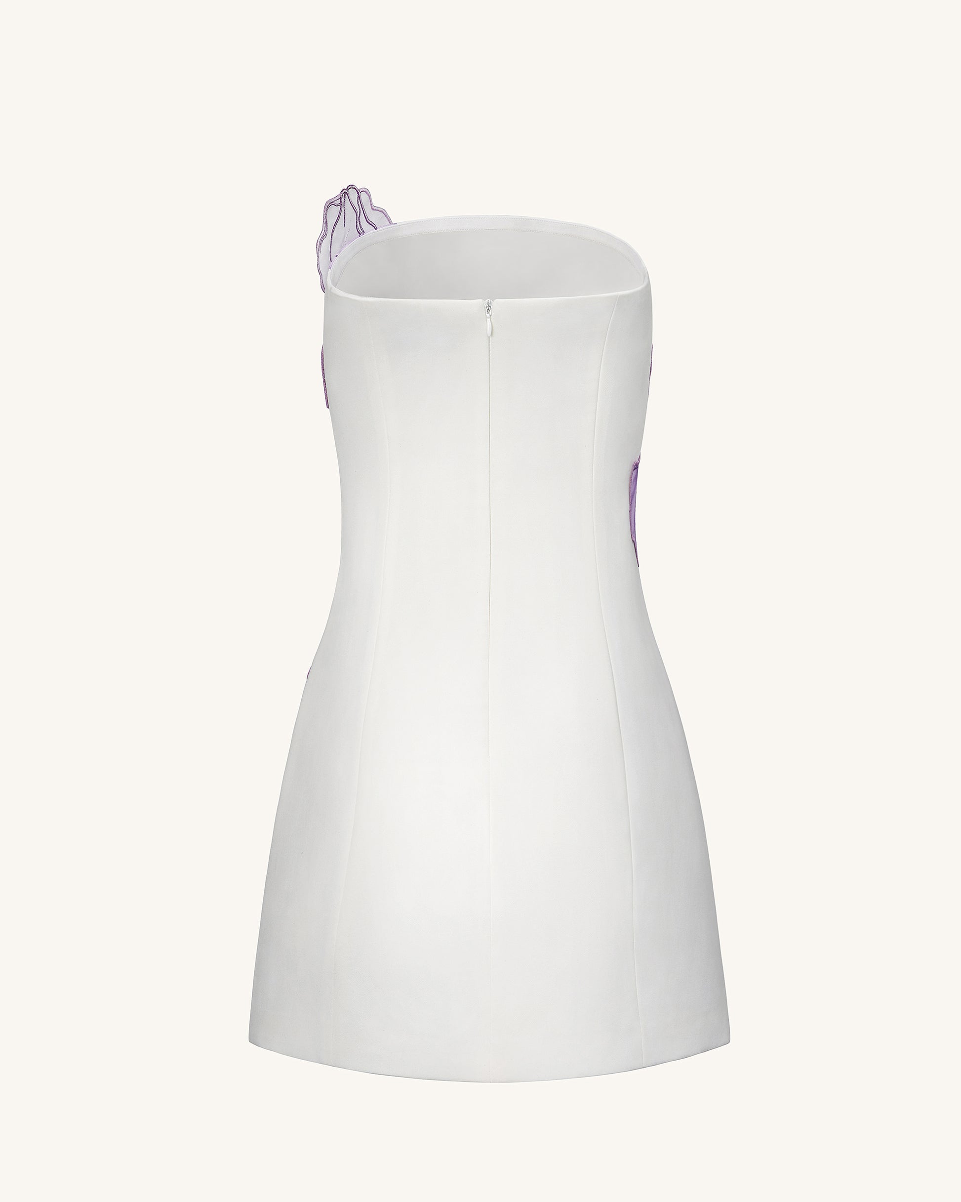 Questo mini abito senza spalline presenta una silhouette aderente e un tessuto liscio e nitido. Grandi motivi floreali di iris in tonalità pastello lilla e verde creano un impatto visivo audace sulla parte frontale. L’orlo pulito termina appena sopra il ginocchio. Lo stile è minimalista con grafiche floreali di grande effetto.