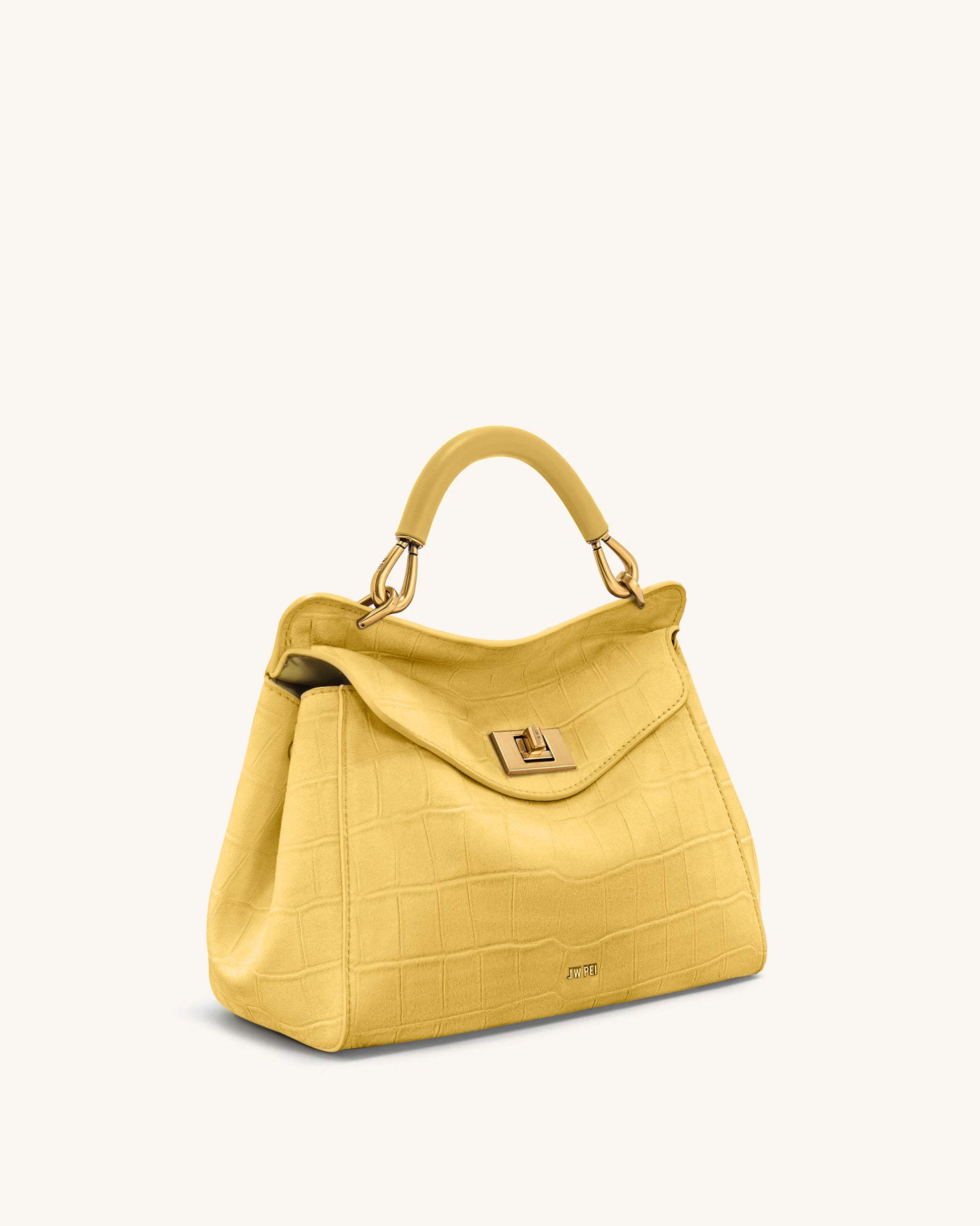 Questa borsa a mano di grande impatto presenta una morbida texture scamosciata con effetto coccodrillo in una calda tonalità di giallo. Arricchita da una chiusura a torsione color oro, un manico strutturato e una tracolla removibile, unisce il fascino vintage alla versatilità moderna—perfetta per valorizzare ogni outfit quotidiano.