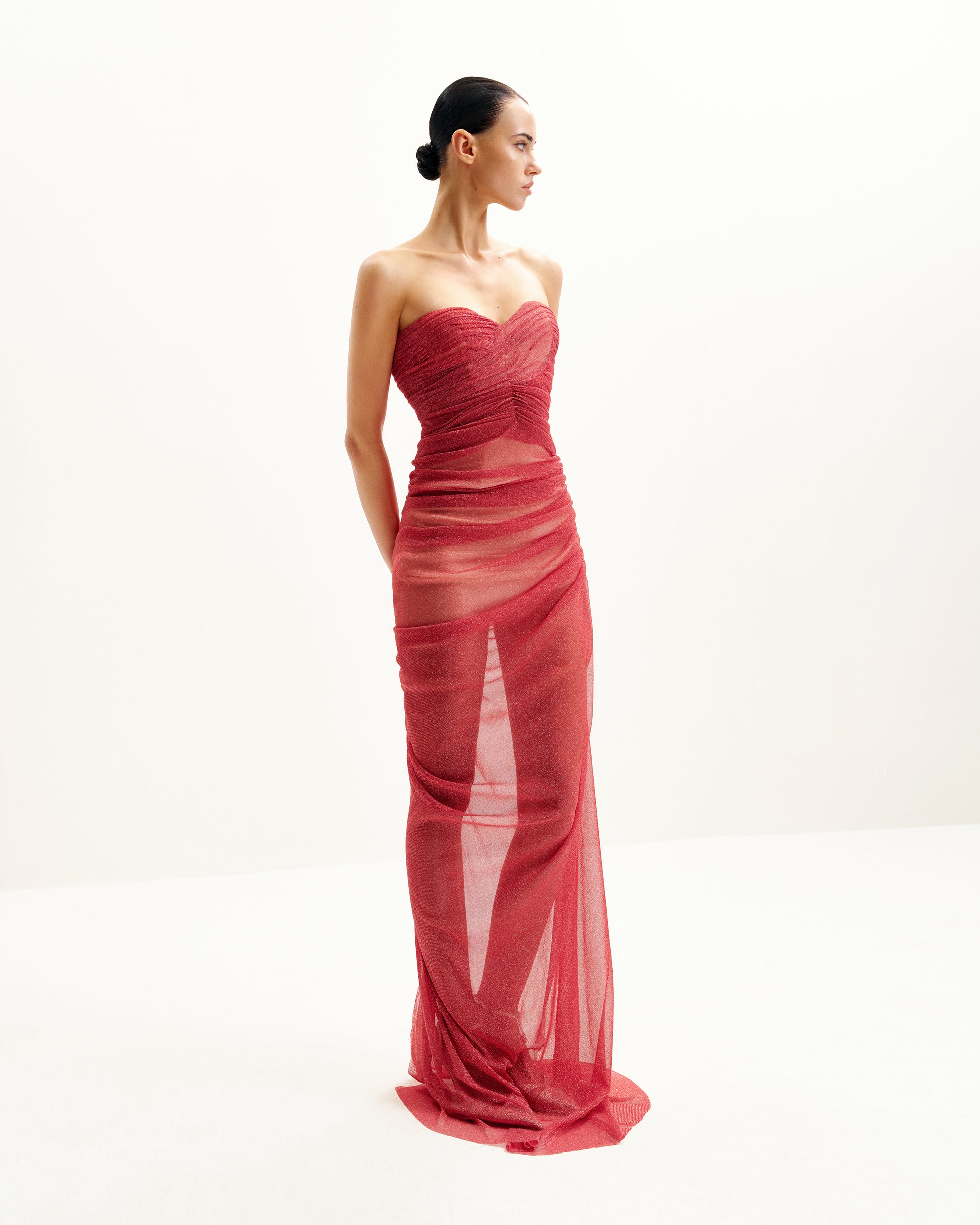 Mia Abito Lungo Senza Spalline Trasparente con Glitter - Scarlatto