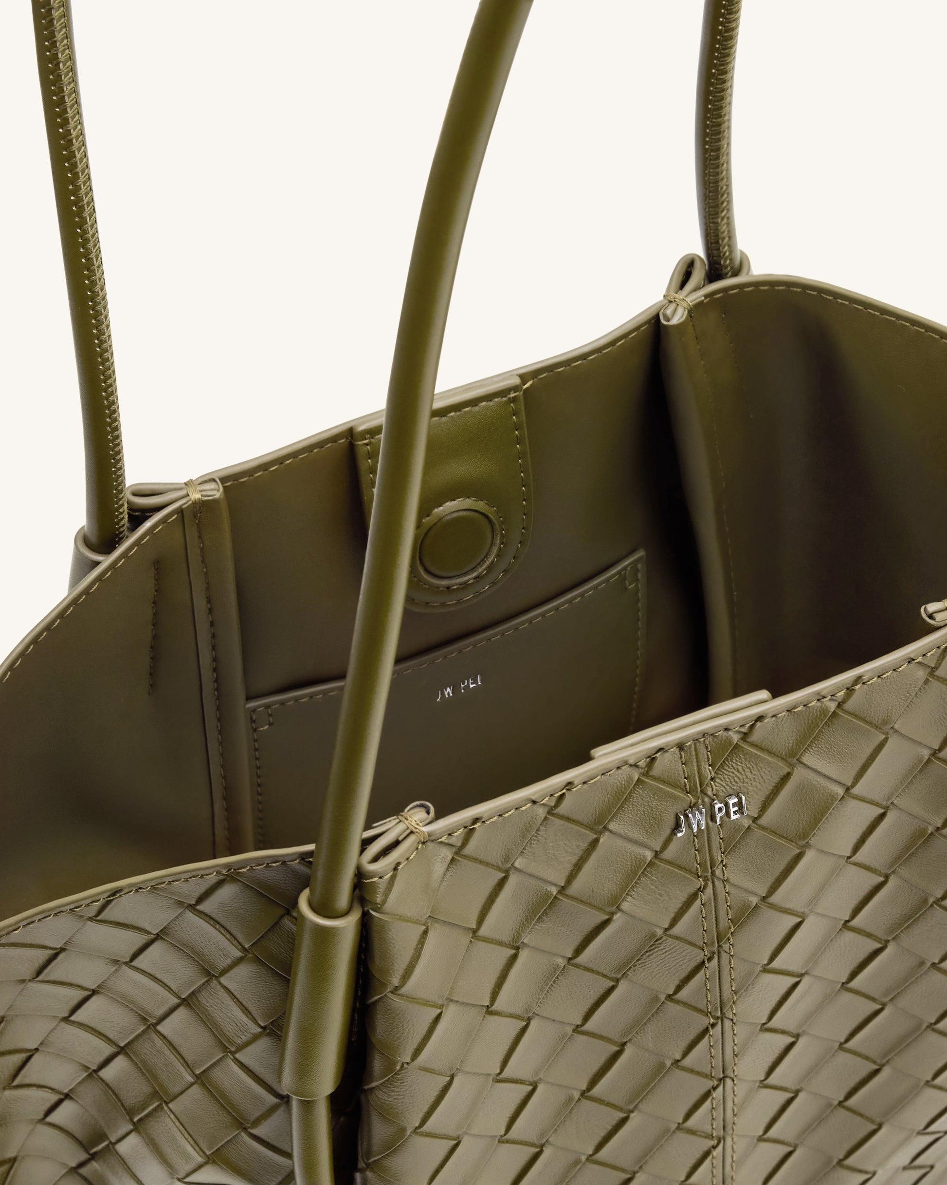 Tote intrecciata elegante e pratica in verde oliva. Morbida pelle vegana con una silhouette spaziosa ed elegante. Dotata di lunghe tracolle per un trasporto versatile.