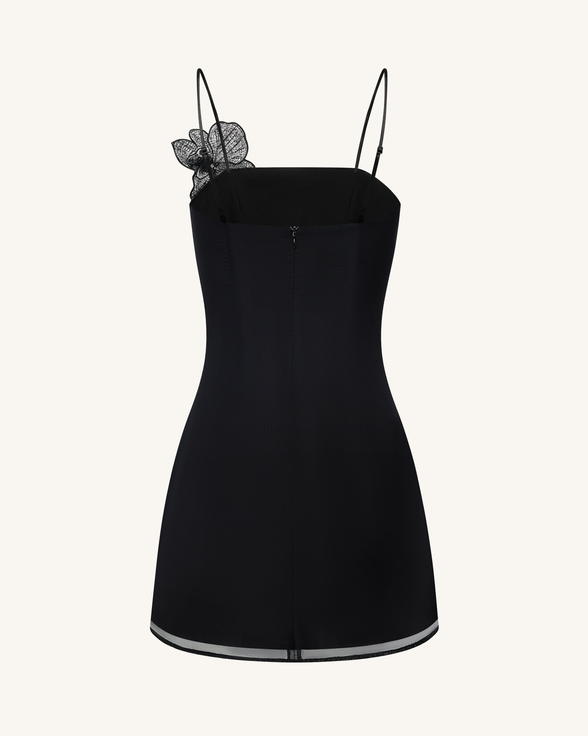 Questo abito mini nero presenta delicati spallini sottili ed è ornato da grandi applicazioni floreali ricamate con lavorazione intricata, che scendono dalla scollatura fino all’orlo. Il design floreale audace aggiunge un tocco di carattere alla sua silhouette elegante e raffinata, perfetto per eventi serali o occasioni speciali.