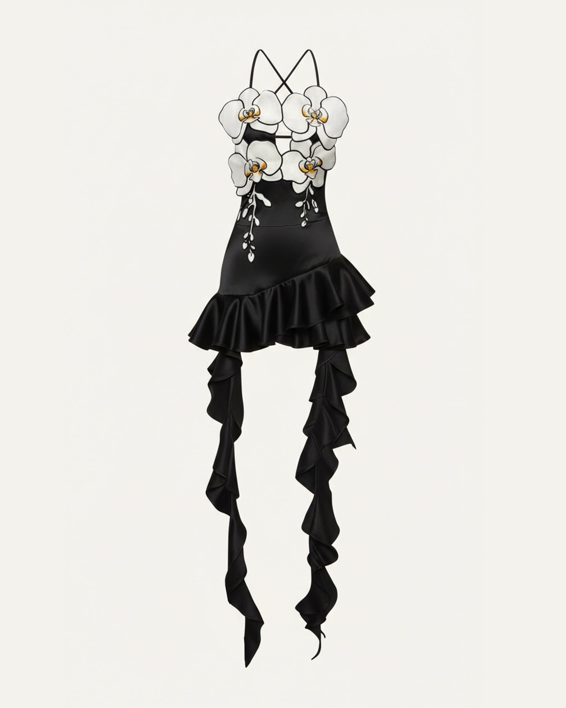 Mini abito con volant e ricamo di orchidee - Nero