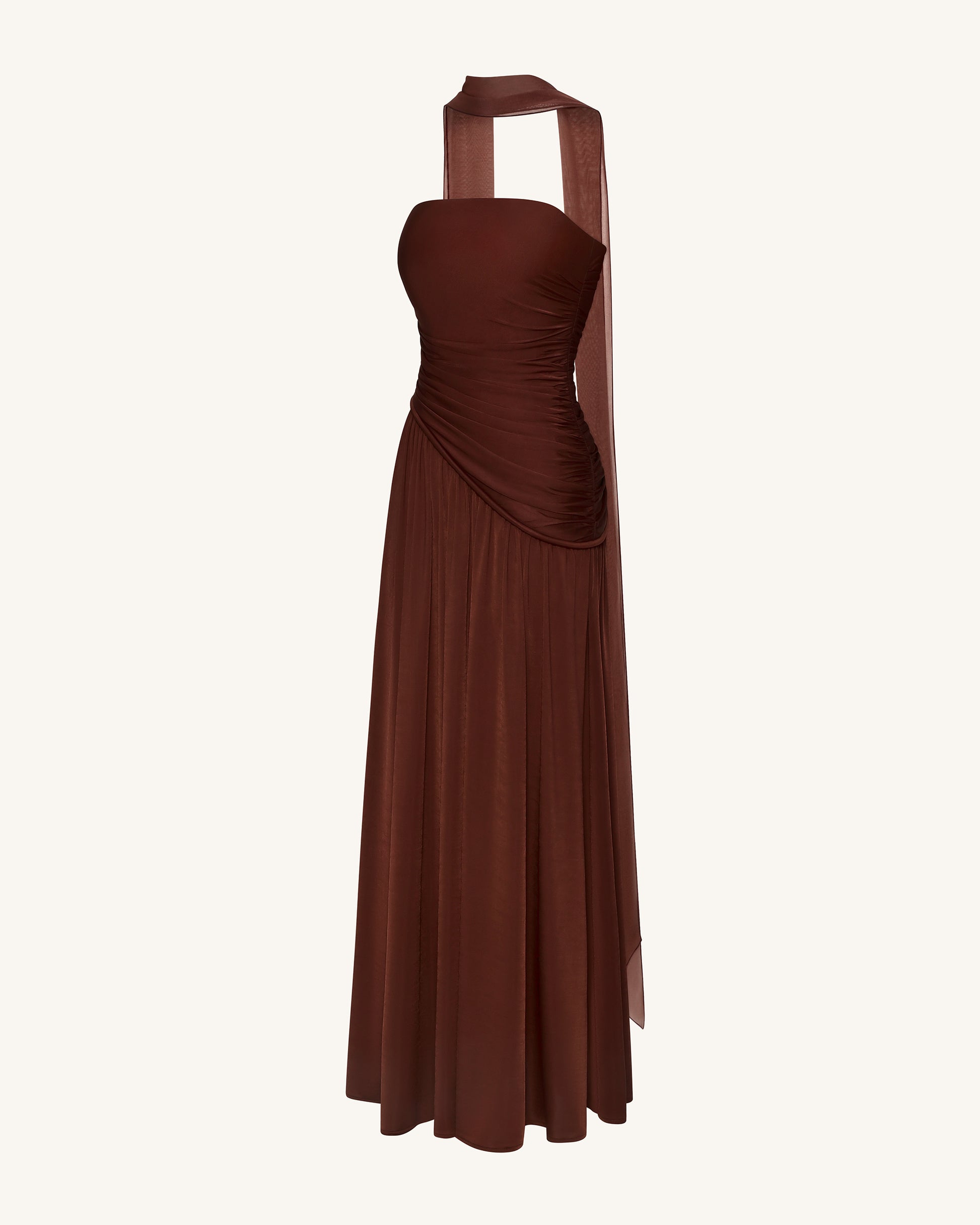 Abito lungo senza spalline con pannello arricciato - Marrone