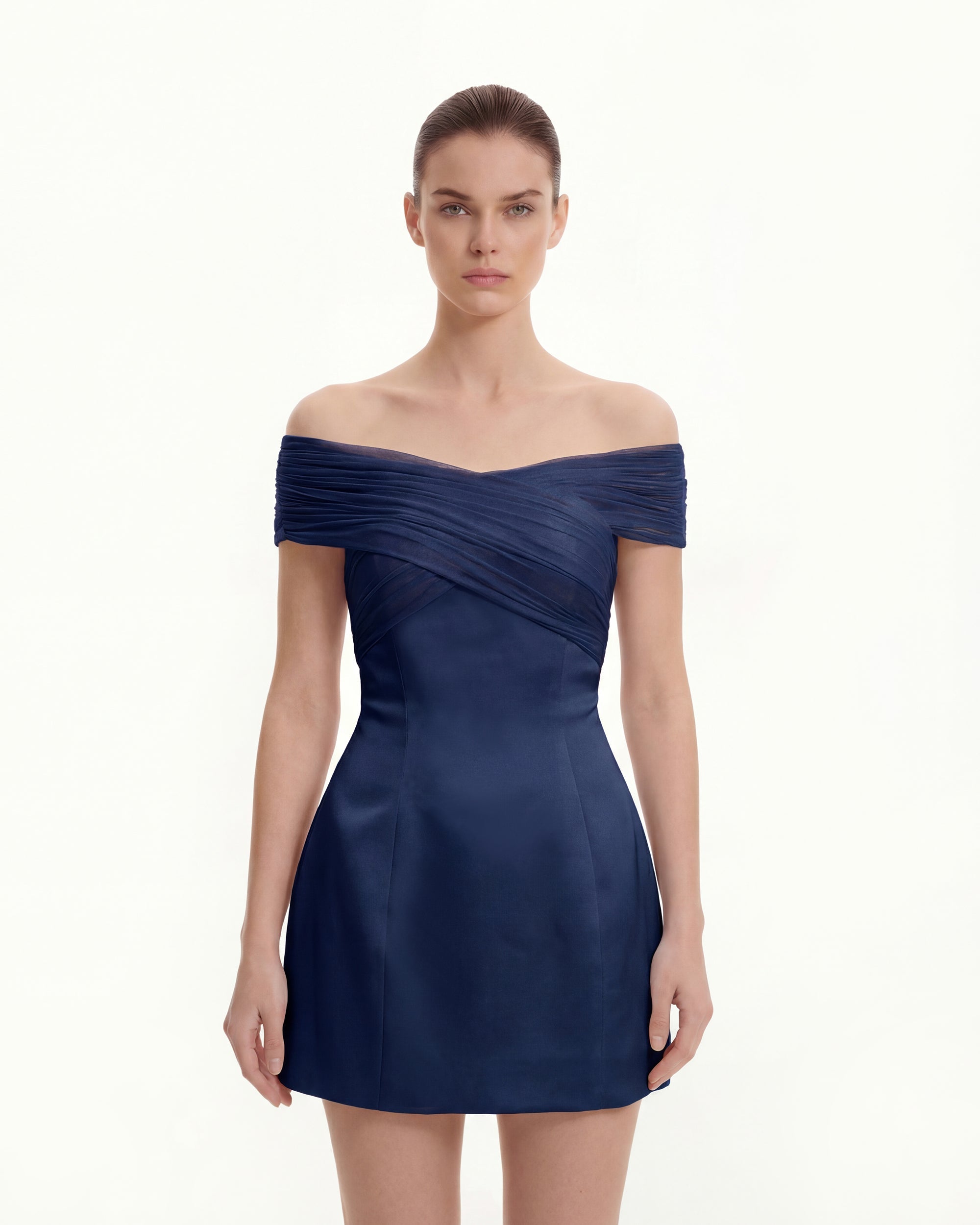 Abito corto in raso con incrociato halter in tulle - Blu navy