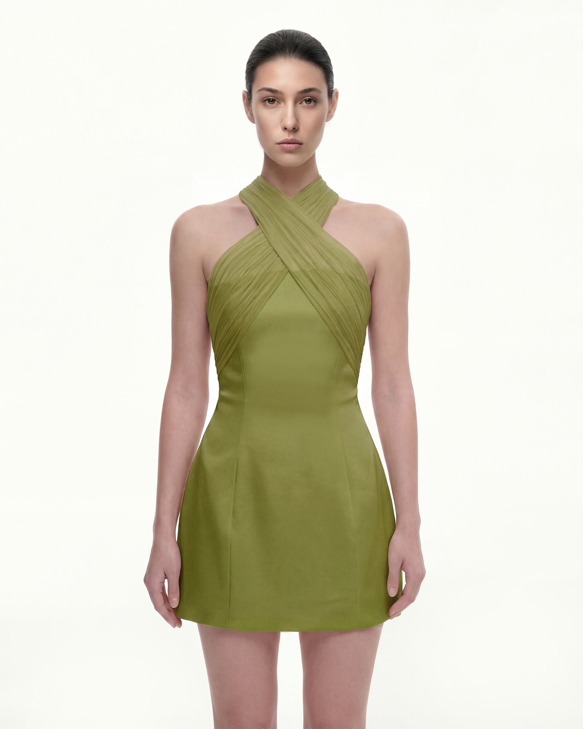 Abito corto in raso con incrociato halter in tulle - Verde oliva